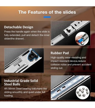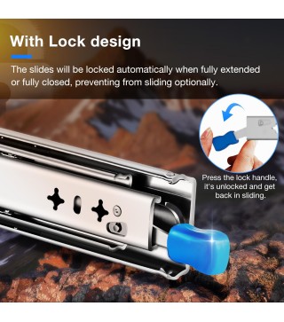 【With hold-still lock & Detachable】 There is a blue handle to lock and unlock.When it is fully extension or fully closed,the slides will be hold still automatically (in locking state),which can prevent from sliding casually and keep your drawer stable and safe. Press the lock handle gently,it's unlocked and get back in free sliding; By press-and-hold the lock handle,and pull outward in the meantime ,the 3rdtrack(the narrowest section) can be separated ,the drawer can be installed and detached.