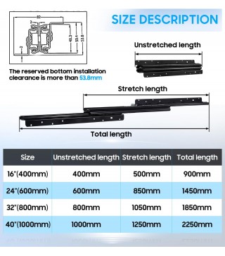 【installation notes】 The slides is under mounted,there should be proper mounting clearance leaved under the drawer. Installation clearance under the drawer at least: 2.1 inch(53.8mm). length of drawer≥length of slides rail. Attention: one set includes a pair of slides without any screws(The type M4 screws can be applicable,you can purchase different M4 screws according your specific application scene)