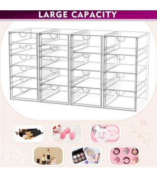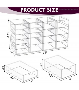 4 Pack makeup organizer with 19 Drawers: Our Acrylic makeup bathroom organizer can maximize space on shelves, dressers ,under the sink, and bathroom counters. There are 19 drawers in total, it’s perfect to organize all your messy items into section, and very easy to take. You can also use them side by side, put your small objects on top of acrylic bins to make your countertop space more tidy. And 4 Pack storage bins with 19 drawers are also enough for you to place in multiple places, very good value.