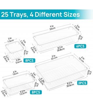 Combination of 4 Different Sizes -- One set includes 25pcs storage bins in 4 different sizes, which help you customize combinations to store items and organize drawer in shelf/ closet/ cabinet/ dresser . Includes: 9 x 6 x 2 inches (3pcs), 9 x 3x 2 inches(6pcs), 6 x 3 x 2 inches(8pcs), 3 x 3 x 2 inches(8cps).
