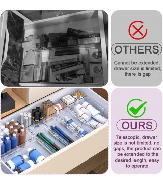 Patented Adjustable Design for Tailored Fit: These stretchable bins feature a patented structure with precision-engineered clips that effortlessly adjust to your drawer size. Designed for maximum functionality and a sleek, modern look