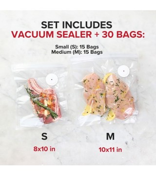 30 Vacuum Bags Total – 15 Small and 15 Medium, grouped into 3 packs of 10 bags each (5 small + 5 medium) for easy portioning and convenient use.