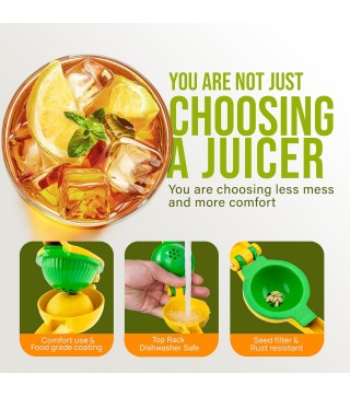 SQUEEZE OUT EVERY DROP OF JUICE: Our 2-in-1 lemon squeezer won’t waste a single drop from your favorite fruit! We have designed this lime juicer to be easy on hands. Watch limes, lemons, and small oranges beg for mercy, even with a soft squeeze. The holes at the bottom of the citrus juicer serve as a seed filter to prevent the pulp and seeds from getting in your way.