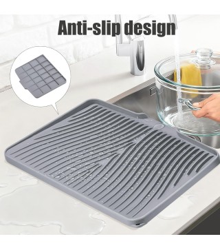 Quick Drying Mat: dish drying mat measures 20" x 15", where washed dishes can be placed for air drying. The folding, raised and innovative design of the quick dry dish mat allows air to circulate under the dishes,and features unique diagonal ridges to easily remove moisture, and a specially designed rim that lets water drain directly into the sink. This keeps your countertops dry and clean, and says goodbye to wet countertops.