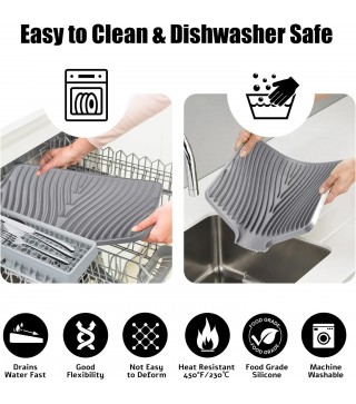 Anti-slip & heat-resistant: non-slip easy clean sink mat has an anti-slip effect, which prevents tableware, vegetables, fruits and glassware from sliding off. It is also an excellent heat-resistant silicone dish drying mat that protects it from high temperatures up to 450°F/230°C, while protecting countertops and tables from hot pots or electrical appliances.