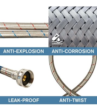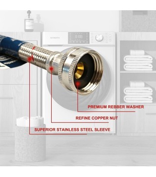 High Quality Production: The washing machine hose is made of safe lead-free material and has passed UPC certification. Both ends are equipped with ultra thick rubber gaskets to ensure that the hose is securely tightened to eliminate leaks. Made of 304 stainless steel weaving, it can prevent water leakage, twisting, curling, and corrosion. Our stainless steel washing machine supply line can work well at high and low temperatures ranging from 15 ° F to 158 ° F