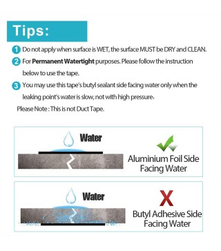 Easy to Use: Simply peel, stick, and press—no extra waterproof coating needed! This ultra-sticky aluminum foil butyl tape bonds instantly and strengthens over time, making removal nearly impossible. For best results, clean and dry the surface before application. (Tip: Due to its high adhesion, wear gloves to prevent sticking to your hands.) Not recommended for high-pressure water areas