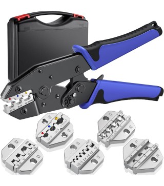 Wire Crimping Tool Set: A very nice hard plastic case that keeps a Heavy duty tool and extra 6 jaws organized. When you need to change different wire connectors, the AWG-marked chrome-plated crimp dies offer you 6 options including "A" - AWG 22-10 heat shrink connectors, "B" - AWG 22-10 Insulated and nylon wire terminals, "C" - AWG 22-6 Non-insulated terminals, "D" - AWG 20-10 open barrel terminals, "E" - AWG 24-8 Insulated cable-end sleeves and "F" - AWG 14-10 solar connectors