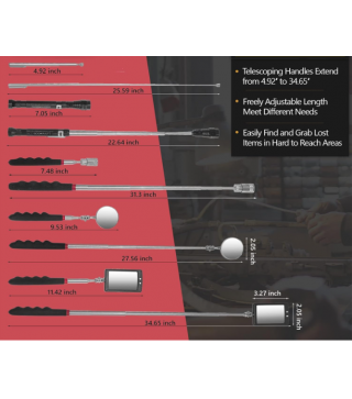 Telescoping Handle: Made from aluminum alloy; shockproof design; handle extends up to 34.65 inches to help grab items in hard-to-reach areas; anti-slip, oil-resistant plastic coating with an ergonomic design for a comfortable grip and effortless use