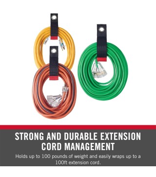 STRONG AND DURABLE EXTENSION CORD MANAGEMENT: Holds 100 pounds of weight and easily wraps a 100ft extension cord; made from heavy duty ballistic nylon webbing