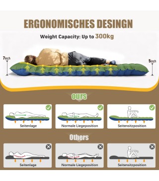 【Durable & Comfortable Camping Mat 】Our 2 person sleeping pad is made of ultra-tough 40D nylon and TPU coating for durability and tear resistant, making the mats suitable for a wide range of outdoor environments. Plus an ergonomic pressure-dispersing water ripple design and one-piece pillow, air pad providing ultimate comfort whether you are lying on your back, side or stomach.