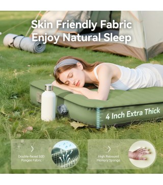 4 Inch Thickness, All Seasons Insulation - Our camping sleeping pad, with an R-value of 9.5, offers outstanding insulation. It keeps you warm in winter and ensures breathability in summer. Once inflated, measures 78.74"x29.13"x4". At the same time, the 4-inch thickness elevates your back and head off the ground, allowing you to lie more comfortably on the mat. It accommodates various sleeping positions, whether you sleep on your back or side